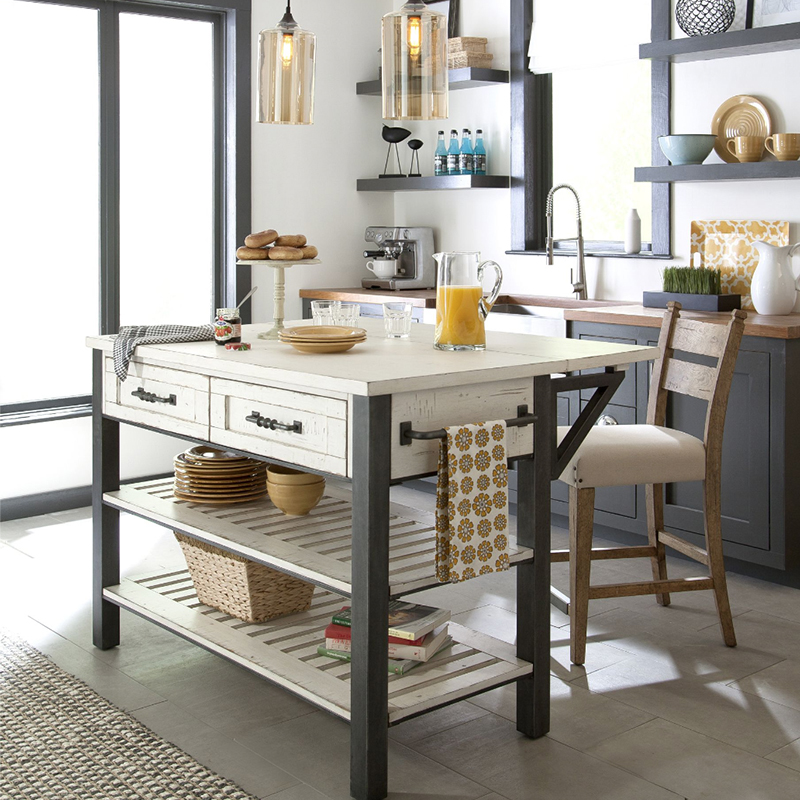 If you have empty space in your kitchen, or you have a shared kitchen and dining space, consider an island. This piece is flexible and easily mobile so you can place it anywhere to create a focal point in your kitchen. Their versatile design allows it to act as storage space for all your kitchen needs and have extra counter space to make cooking and dining simpler. You can use drawers for cutlery or napkins and utilize the under-storage area for dinnerware.