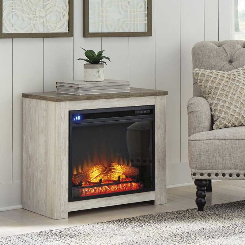 The Ashley Willowtown White Log Fireplace with Insert features a nearly 30 inch wide top area to display your décor. This fireplace can conveniently heat up a 400 square foot room. Find this piece in our outlet at an unbeatable price!