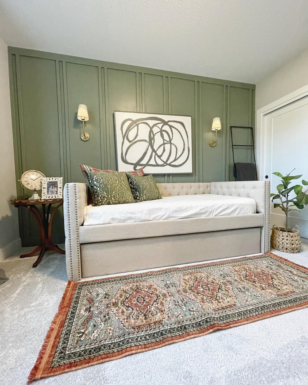Define different areas in the apartment with area rugs. This visually separates spaces and can make the apartment appear larger and better organized. For Living room spaces, you might opt for an 8’ x 10’ rug and for bedrooms, 5’ x 7’.