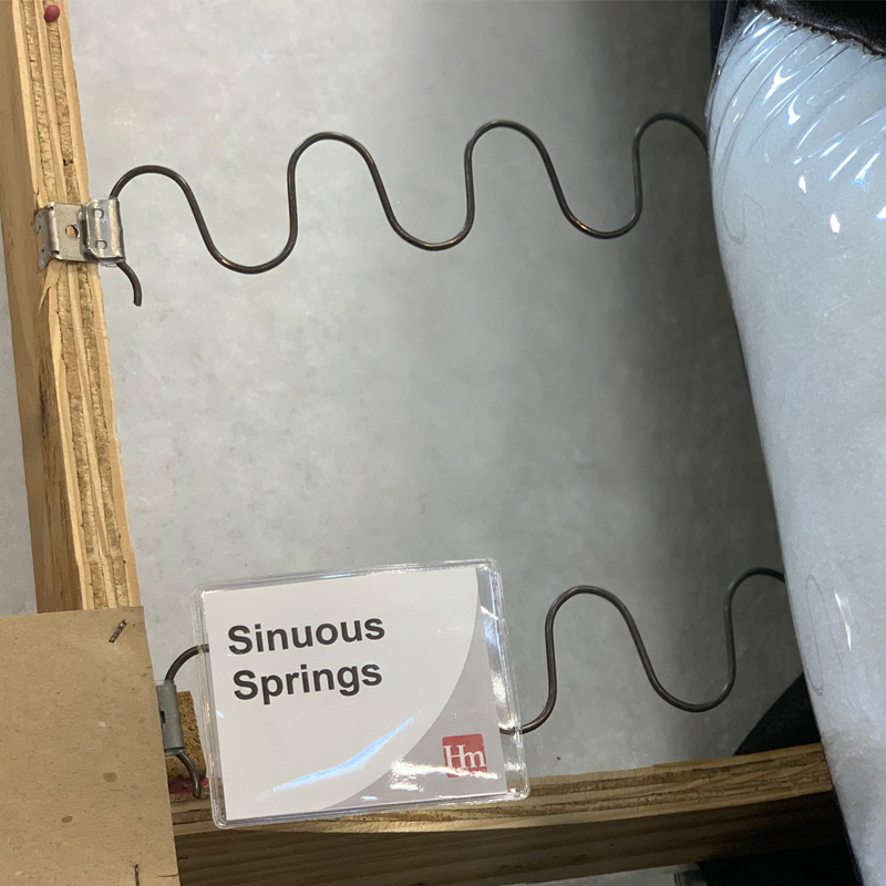 Sinuous spring is the most common type of spring construction. This type of sofa component is a metal, S shaped wire that creates a zig zag shape. They come in single strands that are set in rows, several inches apart. They’re individually attached to the frame of the sofa. This construction makes it easier (and cheaper) to replace if one of the wires breaks. When pressed on, the sinuous spring creates a flexible, spring-like action that provides support to your body.