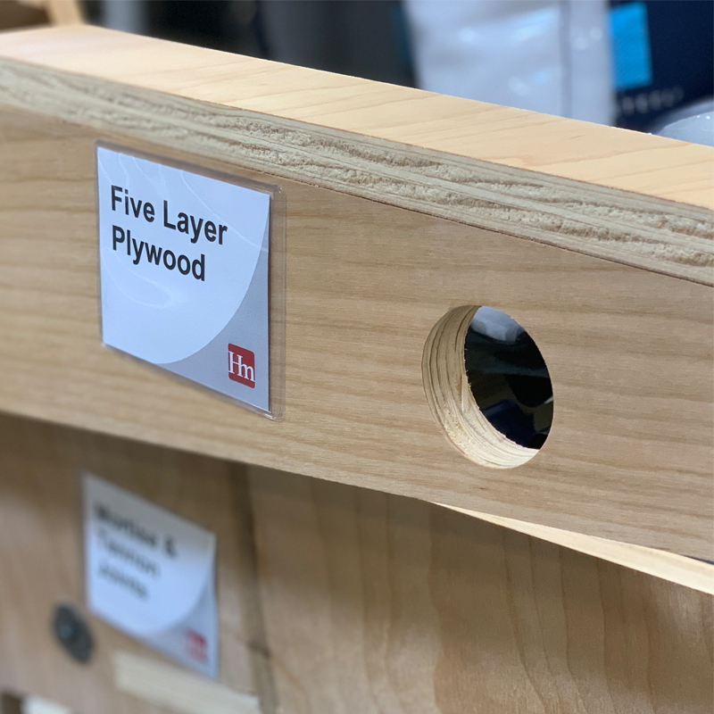 Plywood is a material generated from thin layers of wood veneers that are glued together to created layers of wood. Depending on the level of quality the manufacturer wants the furniture to be, these layers can range from three to seven layers. The more layers, the more durable and thicker the wood is, ultimately making the frame stronger and last longer. The layers are glued at different angles to one another to create a low-density, lightweight piece.