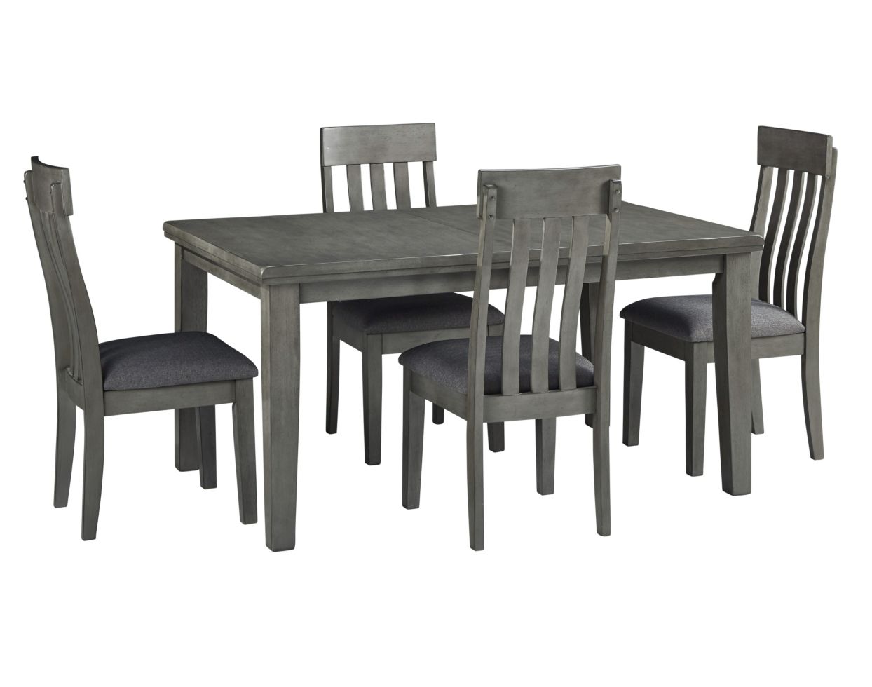 Explore contemporary styling in your home with this fabulous five-piece dining set. Stacked with chic features, this set includes four side chairs with a slat-back design and soft upholstery seat, plus a dining table with butterfly leaf construction for extra seating space. The minimal silhouette and sleek gray finish gives your dining space a style stamp of approval.