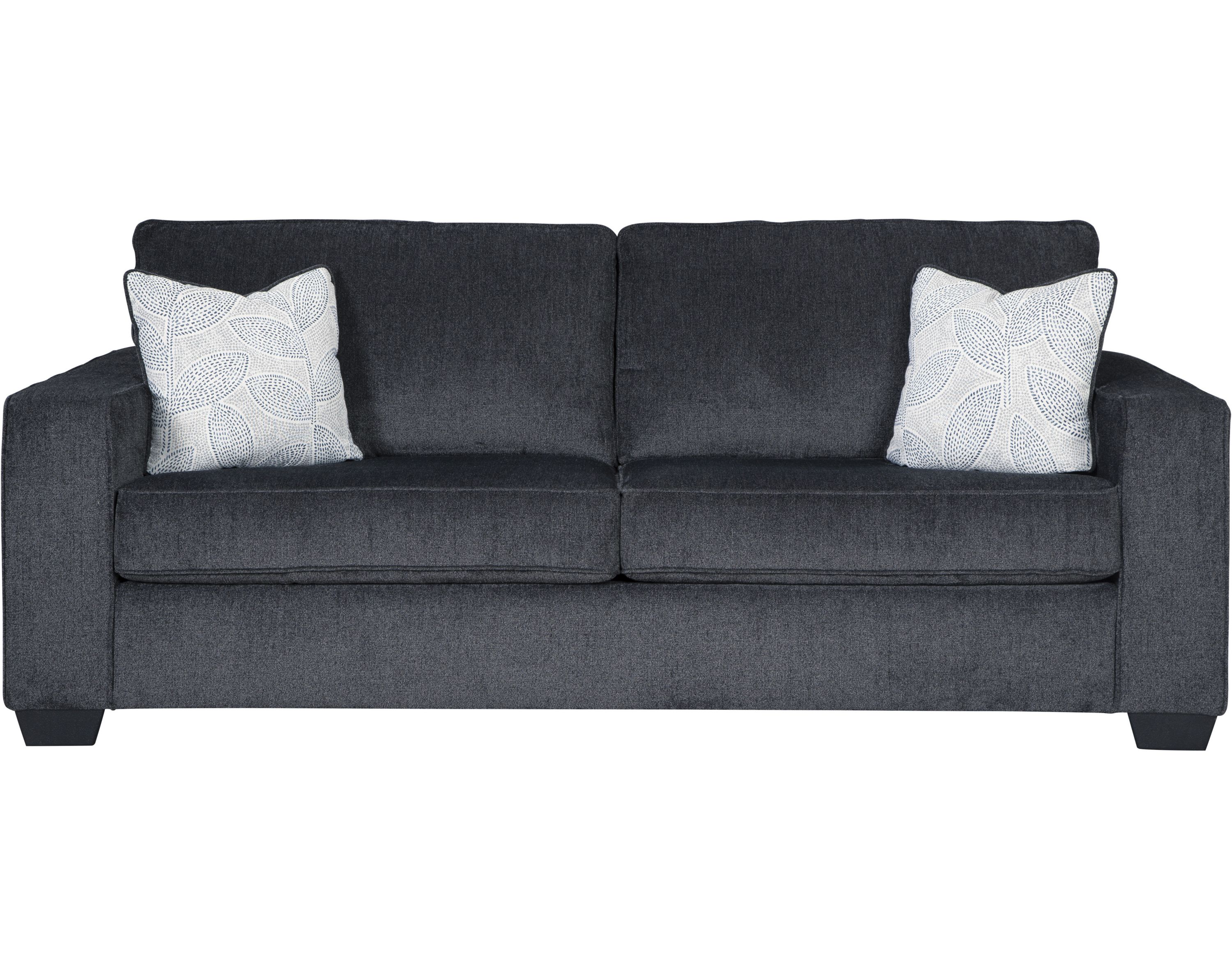 Clean contemporary style is yours with this versatile sofa. It features track arms, plush foam cushioning and a pillow back. The soft chenille upholstery in smoky gray and two subtly patterned accent pillows make this an easy addition to any living space. The deeper seats and wider width of this piece add to its comfort and its size.