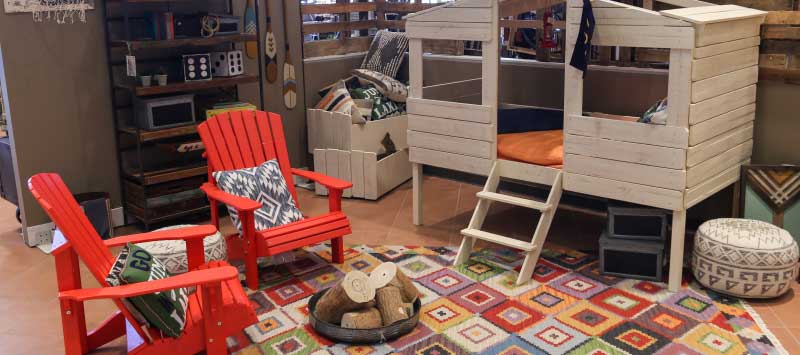 If your children love nothing more than a weekend camping trip and sleeping under the stars, this bedroom is for them! Our treehouse-inspired loft bed is the star of the show, igniting your child’s imagination during the day and providing a cozy place to snooze at night. Create a make-believe firepit with birch logs, Adirondack chairs, poufs and bright pops of color with red and hunter green décor. The in-store exclusive bookcase showcases galvanized metal boxes, giant dice sculptures, fun clocks and nautical accessories. Adventure awaits!